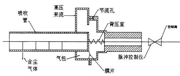 脈沖除塵器的噴吹系統 布袋除塵器的噴吹系統包括儀表、氣源、空氣管路、分氣包、電磁脈沖閥、噴吹管等。每排濾袋上有一根噴吹管,通過電磁脈沖閥與分氣包相連。